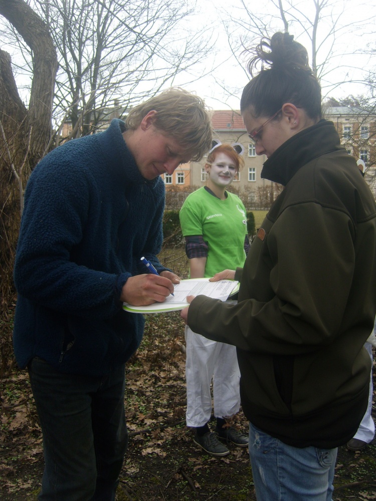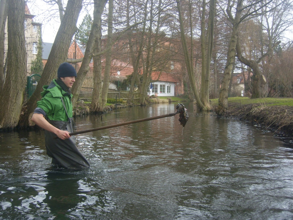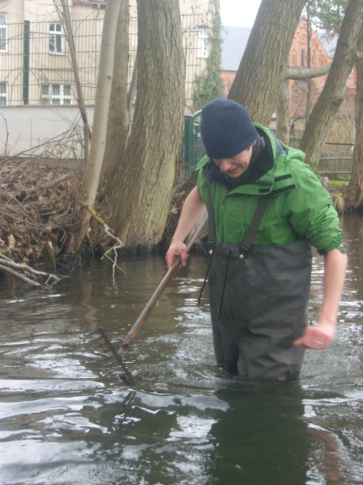 An der Schwärze reinigten wir — wie jedes Jahr — sowohl das Ufer als auch das Flussbett selbst, indem wir zu zweit mit Wathosen die gesamte Schwärze von der Brücke vor der Mensa (Stadtcampus) bis zur Brücke am Ende des Ammonparks nach Müll durchsuchten. Highlights aus der „Schwärze-Schatzgrube“ waren eine Tischdecke, ein Fahrradsattel, 8 Gläser aus dem Studiclub und ein Familienfoto aus einer Sofortbildkamera. Eine andere Gruppe fuhr mit zwei Kanus auf der Schwärze bis zum Finowkanal, um dort das Ufer zu reinigen. Das Resultat waren drei gefüllte, große, blaue Müllsäcke. Obwohl das offizielle Ende des Frühjahrsputzes um 12 Uhr war, blieben wir noch bis halb eins im und am Fluss, weil es so aufregend war, immer wieder neue Fundstücke zu bergen.
