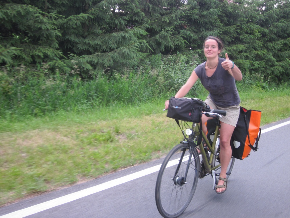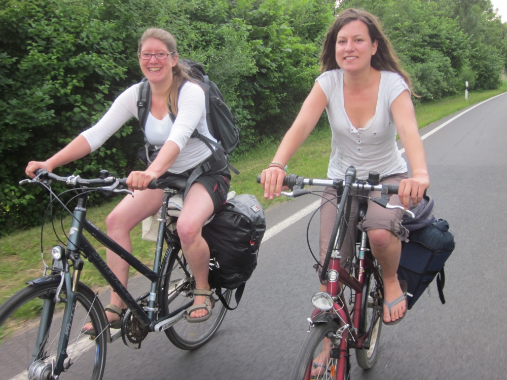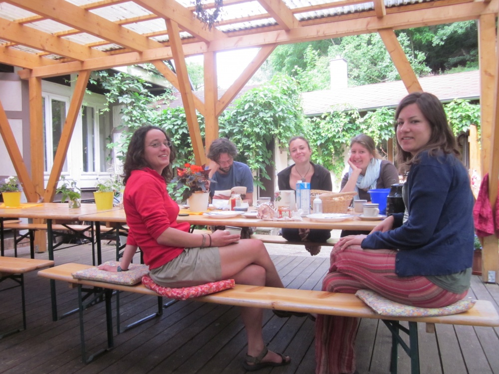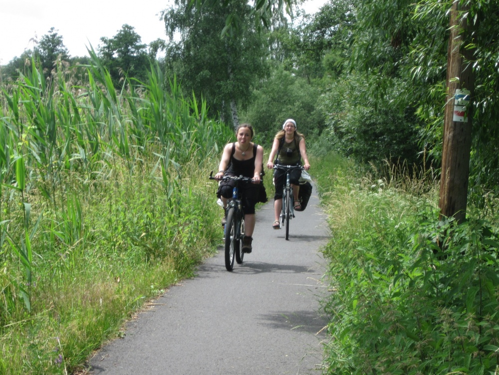 Von dort aus ging es nach Tal-, Berg- und wieder Talfahrt zum Haus der Naturpflege in Bad Freienwalde, auf einem Berghang des schönen Kurstädtchens thronend. Es vermittelte uns eindrücklich die lebenslangen Bemühungen der beiden Eheleute Erna und Kurt Kretschmann um den Naturschutz in der Region. Das Haus ist umgeben von einem schönen Garten, in dem Erdbeeren wuchern, einem der Gewöhnliche Pfeifenstrauch durch seinen Duft die Sinne betäubt und allerlei weitere Bäume, Sträucher und Blumen gedeihen. Stundenlang könnte man dort unter der alten Eiche liegen! Aber wir wollten weiter zum Baasee… dessen Zufahrtsweg uns trotz langem Suchen verwehrt blieb. Also gings zum Teufelssee, an dem zu Zeiten der Kretschmanns noch der Bärlapp wuchs. Das kühle Nass erfrischte den verschwitzten Körper und machte ihn reif für das Abendbrot zurück im Heuhotel am Haus der Naturpflege. Unterwegs gesellte sich noch eine fünfte Reisende mit zu uns, und so aßen wir, entzündeten das Feuer im Garten und saßen noch lang bis in die frühen Morgenstunden.