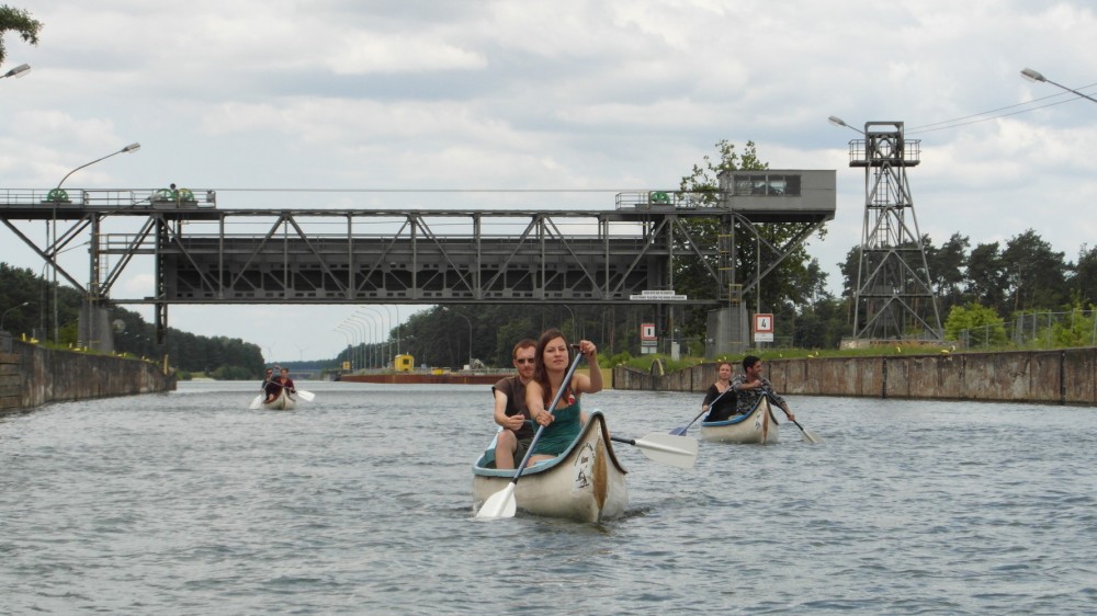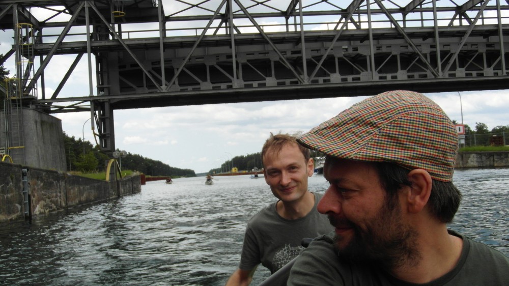 Das Schiffshebewerk Niederfinow, dessen Benutzung erstaunlicherweise selbst für Sonntagsfahrer kostenlos ist, beförderte uns 36 Meter hinab ins Oderbruch, wo wir die Einfahrt zum Finowkanal fanden und auf brennesselreicher Uferbank unser Mittagessen einnahmen. Dann ging es auf dem kleineren Kanal zurück nach Eberswalde, genauer gesagt, bis zur Ragöser Schleuse. Dort hatten Vorstandsmitglied Jan und seine Nachbarn auf ihrer Schaf- und Gänsefarm ein Nachtlager für uns vorbereitet. Mit selbst gekochter Suppe, Lagerfeuer und Musik fehlte es an nichts.