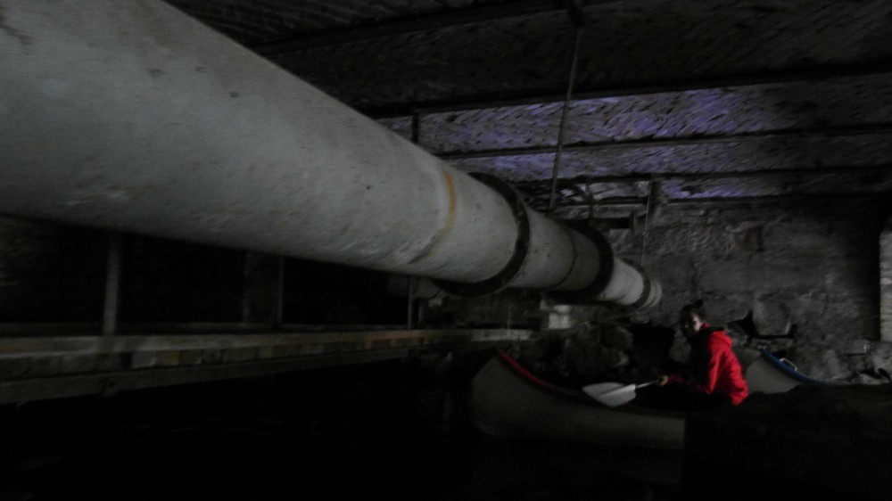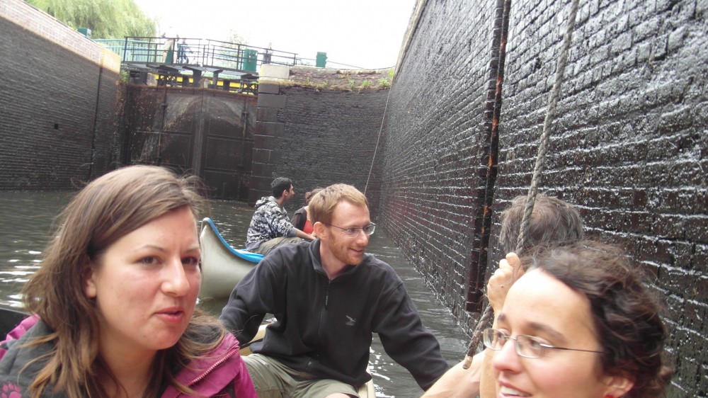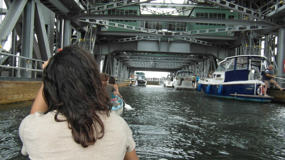 Am Sonntag setzten wir unsere Fahrt nach Westen fort und ließen uns durch diverse Schleusen den Kanal hinaufbefördern, mitten durch die Stadt, die wir sonst nur vom Ufer aus kannten. Besonderen Eindruck hinterließen die spuckenden Muscheln in der Kupferhammerschleuse — Zoologie zum Anfassen sozusagen. Noch etwas unheimlicher war die Einfahrt in den unterirdischen Teil der ehemaligen Papierfabrik. Bis zum Flussbadetag nach Finow schafften wir es nicht, unsere Fahrt endete an der Schleuse Wolfswinkel, braungebrannt und mit gehörigem Muskelkater.