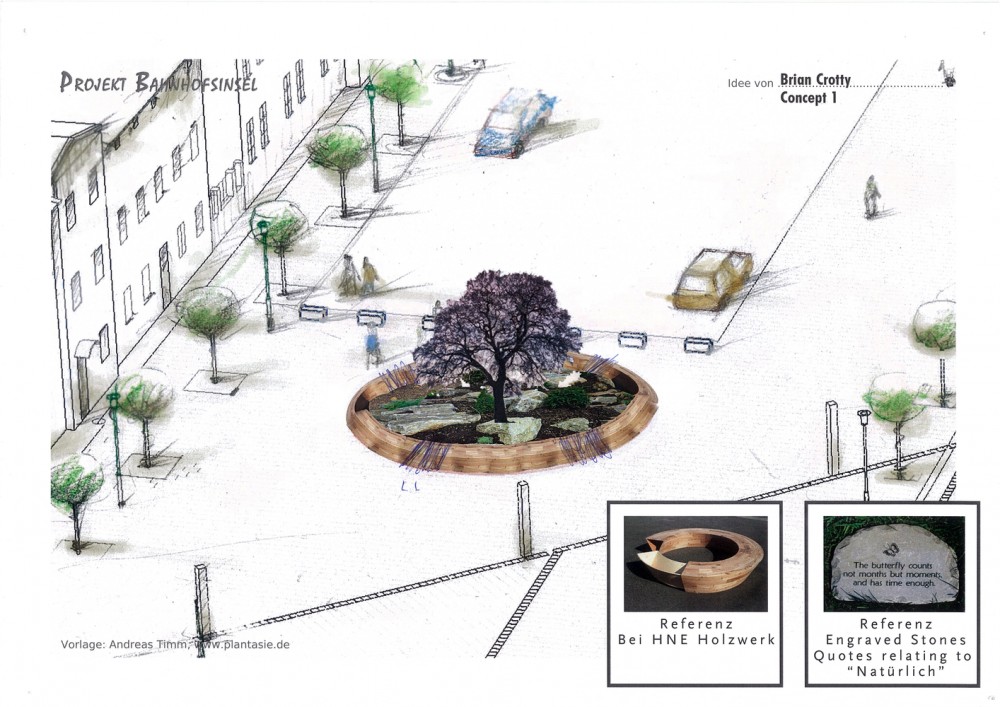 Idee: Im Zentrum der Insel wird ein Solitärbaum gepflanzt und mit einer Rundbank umgeben, die nach außen und innen benutzbar ist. Die Baumscheibe wird wahlweise mit großen Natursteinen (mit eingravierten Zitaten zum Thema Natur), als Blumenuhr oder als „Nest “aus Hölzern gestaltet.