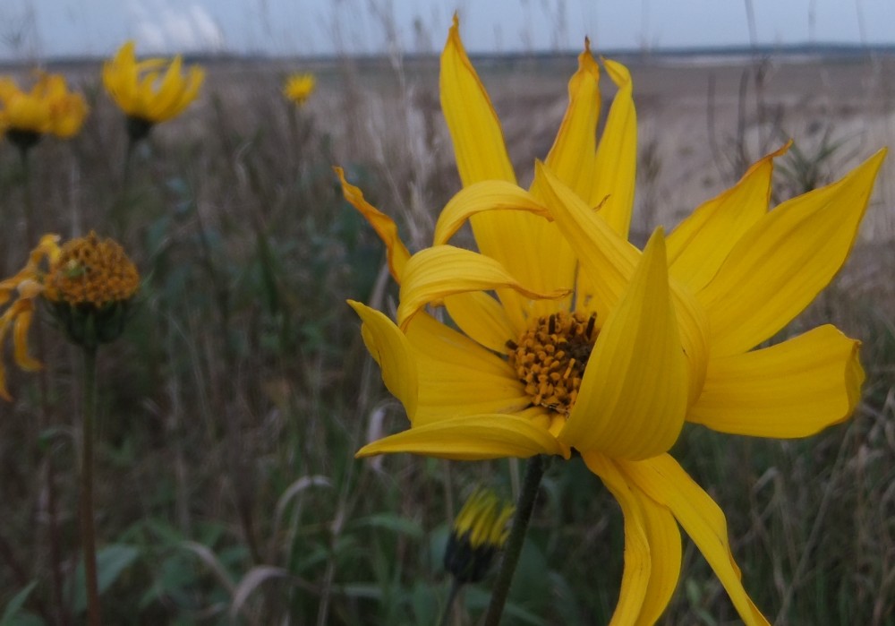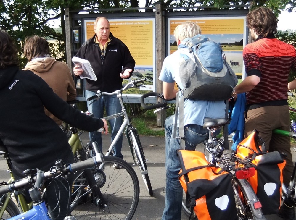 Mit den Rädern fuhren wir am Samstag zum „Möbusprojekt“, welches zur Interessengemeinschaft Bauernhaus e.V. gehört. Das „Möbusprojekt“ ist ein altes, typisch spreewäldisches Bauernhaus, genannt „Wohnstallhaus“, das nach alter Bauweise wiedererrichtet wird. Der Bauherr persönlich packte seinen reichen Wissens- und Erfahrungsschatz rund um das Haus aus und zeigte es stolz von allen Seiten. Im Anschluss bekamen wir noch eine Führung durch den angrenzenden, von Ehrenamtlichen gepflegten Heil- und Gewürzkräutergarten. Nach der Mittagspause im Gasthaus „Glück auf“ fuhren wir lange Zeit an der Spree und ihrer renaturierten Auenlandschaft entlang, bis wir zum vereinbarten Treffpunkt kamen, an dem uns ein Vertreter des Vattenfall-Konzerns begrüßte. Er stellte uns das im Jahr 2012 fertiggestellte Projekt „Spreeauen-Renaturierung“ vor, das von Vattenfall als Ausgleichsmaßnahme für die Stilllegung der Lakomaer Teiche im Bereich des Braunkohleabbaugebiets Cottbus-Nord durchgeführt wurde. Dazu schauten wir uns neu angelegte Sohlschwellen mit integrierten Fischtreppen, 8 neu angelegte Teiche und ein extensives Beweidungsgebiet mit Tarpanen, Heckrindern und Wasserbüffeln an. Zum Tagesabschluss fuhr unser Grüppchen noch zum Tagebau, der die genannte Ausgleichsmaßnahme notwendig machte und besuchten die Gaststätte „Spreewaldmühle“.