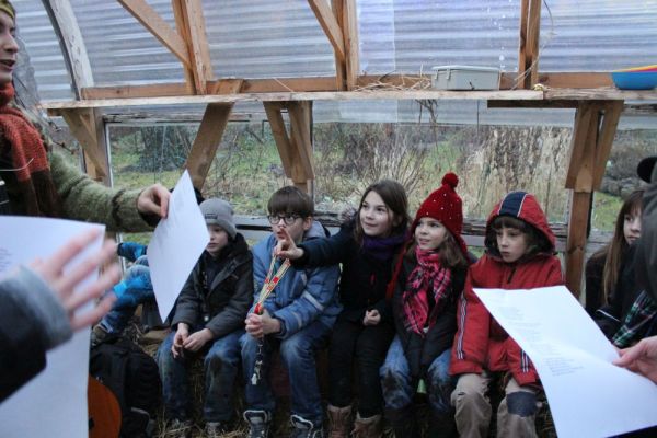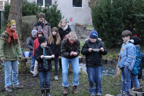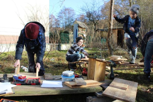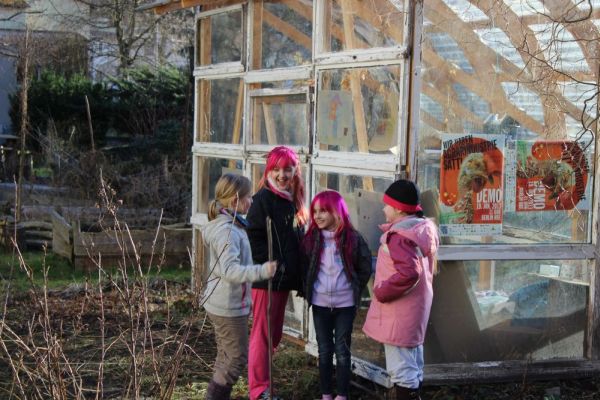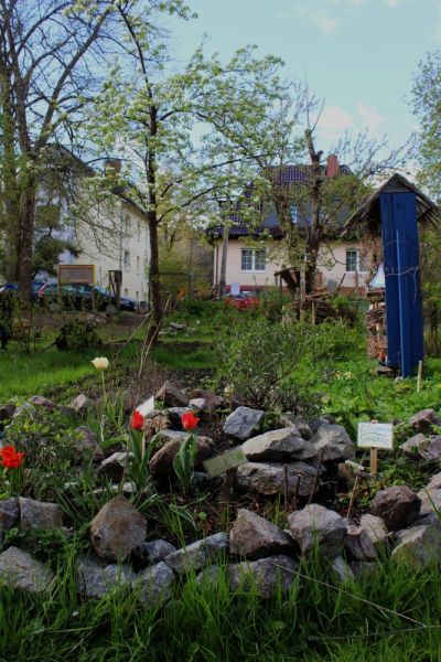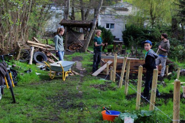 Der Schulranzen fliegt über den Gartenzaun. Aha, die Schulgartenkids kommen! Die Uhren kann man nicht nach ihnen stellen, dafür die Ohren. Sie nähern sich lautstark. Sie sind Kinder von der Goethe-Schule, zweite und dritte Klasse. Sie tun so, als wäre der Schulgarten eine schwere Verpflichtung für sie. Sie laufen den zugewachsenen Weg zum Schuppen hinter und fragen mich, was heute ansteht. In bedeutungsvolle Worte gehüllt, versuche ich das Erdbeeren verziehen nett zu umschreiben. Die Mädels stapfen direkt zum Tümpel durch und holen sich Hacken um alte Äste und Steine herauszuziehen. In den weiteren zehn Minuten hat Dario seine Packung Frischeiwaffeln vertilgt. Wir machen uns an die Arbeit. Mal ist einer wahnsinnig eifrig, dann ein anderer unglaublich gesprächig. Sie lachen und toben durch den Garten und vergessen darüber die Playlist auf ihrem Handy.