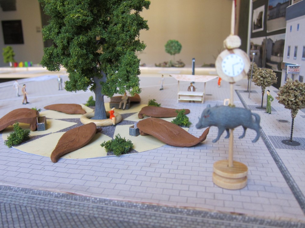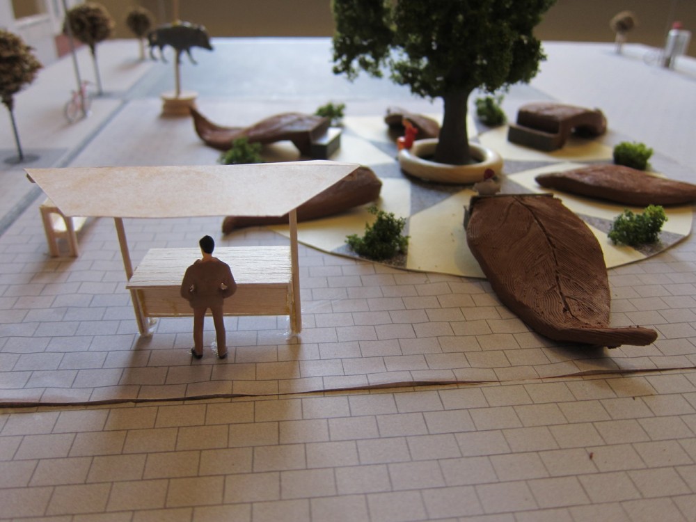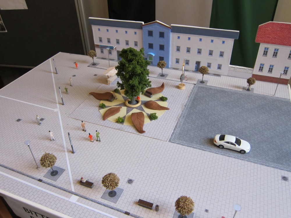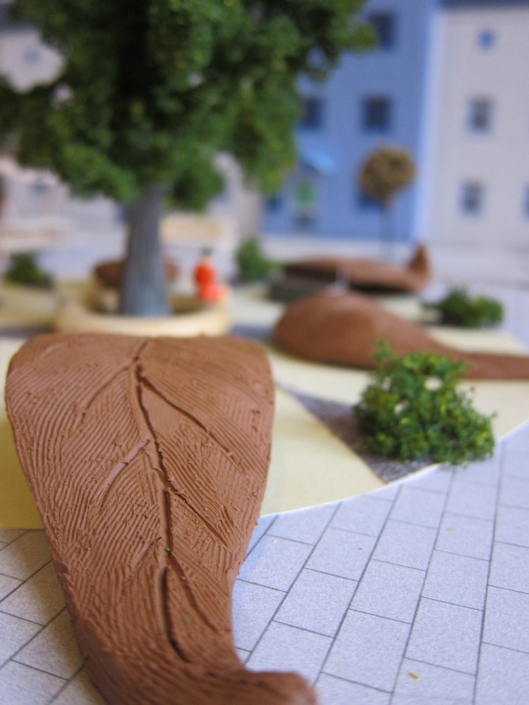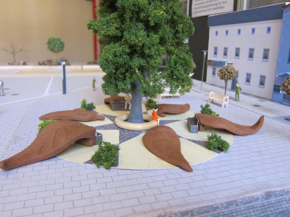 Der hier gestaltete Platz soll als Ruhepol im laufenden Transfergeschehen des Bahnhofs dienen ― ein für das Auge in sich ruhendes Konstrukt aus Funktionalität und Ästhetik. Die zentral angelegte Eßkastanie als Blickfang spendet Schatten und zur Reifezeit eine gut verpackte Delikatesse. Riesige Blätter verschiedener Baumarten, aus Holz gefertigt, sind sternförmig um den Baum angelegt und laden ein zum Sitzen, Liegen, Rutschen, Klettern… Ebenfalls als Sitzmöglichkeiten dienen ein Podest um den Stamm, abließende Bänke an den Riesenblätten und zwei Standbänke. Dies sind Sitzbänke, die bei Bedarf in überdachte Verkaufsstände umfunktioniert werden können (das benötigte Equipment befindet sich in der Bank). So kann auf ästhetische Weise z.B. Saisonobst und Gemüse angeboten werden und durch die Vermietung der Standbank der Erwerb derselben rückfinanziert werden.