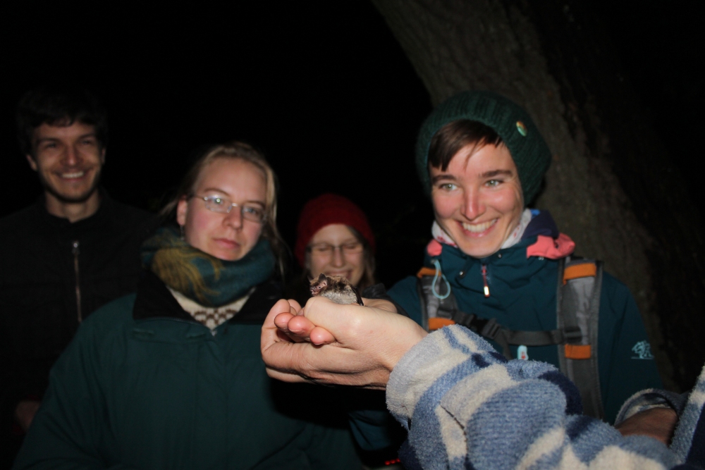 Trotz des Regens trauten sich einige Enthusiasten in die Nacht hinaus um mit Jörn Horn nach den Fledermäusen an der Zainhammer Mühle zu suchen. Schon auf dem Mühlteich konnten wir Wasserfledermäuse bei der Jagd beobachten und ihre Rufe hören. Die vielen biologischen und ökologischen Besonderheiten dieser faszinierenden und bedrohten Artengruppe erlebt man am Besten, dort wo sie leben.