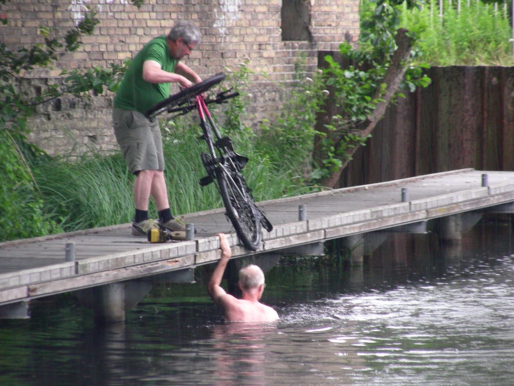 Der Stimmung der Leute vor Ort tat dies aber wahrlich keinen Abbruch. So hüpften gut ein Dutzend Mutige unter tosendem Beifall der Schaulustigen um 15 Uhr in den kühlen Finowkanal. Chapeau!
