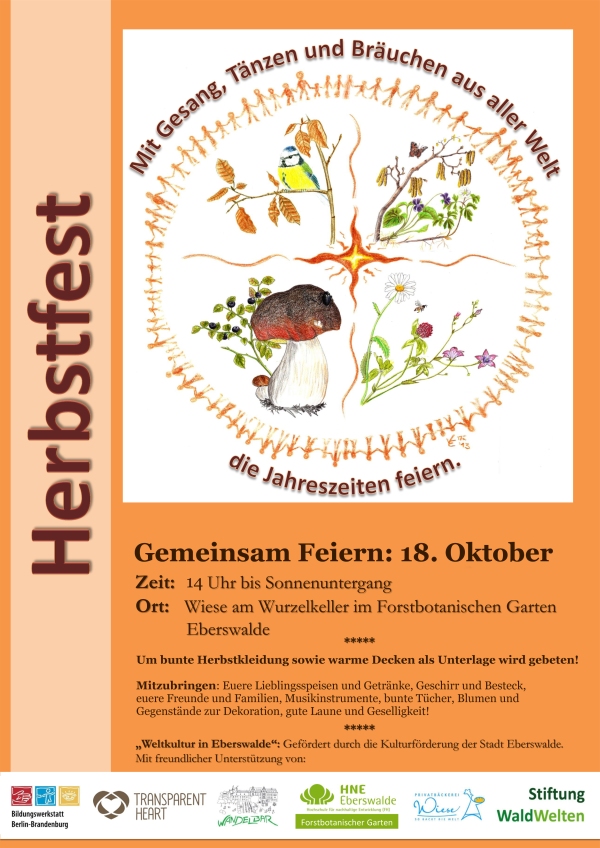 14:00Forstbotanischer Garten EberswaldeDas Herbstfest im Forstbotanischen Garten, auf der großen Wiese am Wurzelkeller, steht vor der Tür. Jeder, ob jung oder alt, ist herzlich eingeladen sich mit seiner Familie, Freunden und Bekannten an diesem bezaubernden Ort um ein wärmendes Feuer zu setzen. Zusammen wird bis Sonnenuntergang gesungen und getanzt, um den Herbst zu begrüßen und zu feiern.